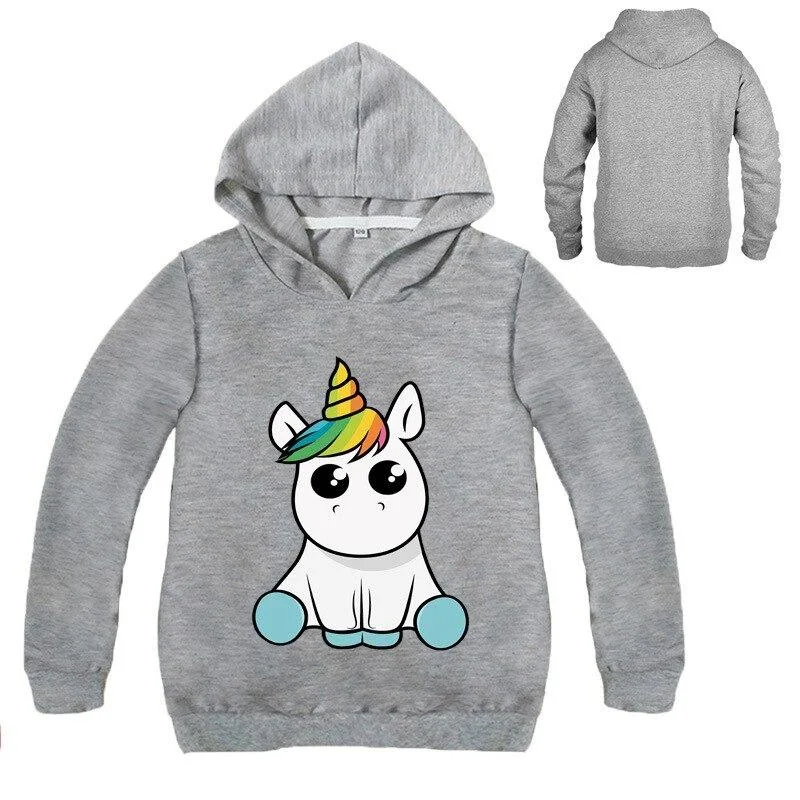 Ce Sweat Licorne Capuche Gris pour fille est extrêmement confortable grâce à son tissu spécial. Son design original apporte une touche de style tendance. Pull-over manches longues et col rond.